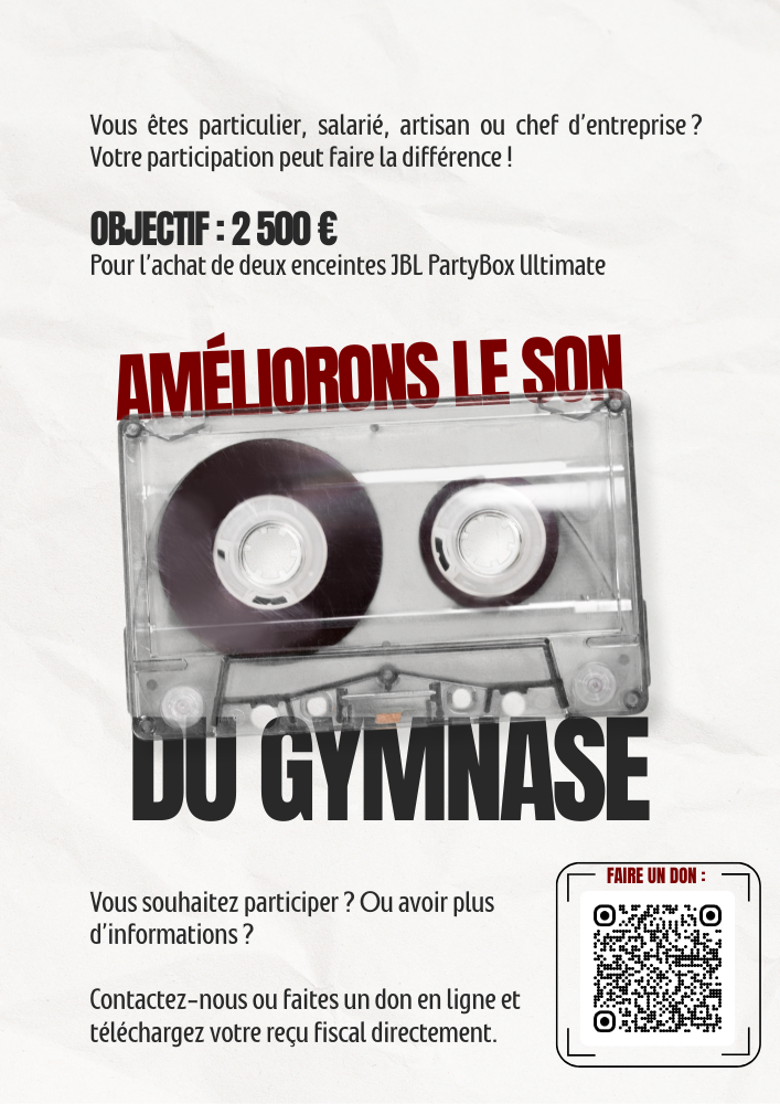 Le Club lance une campagne de dons afin d’améliorer le matériel audio du gymnase. Un équipement de qualité est essentiel pour motiver nos gymnastes et créer une ambiance agréable lors des entraînements, compétitions et événements du club.